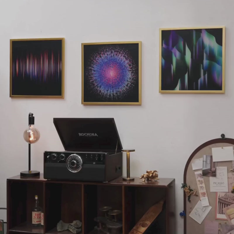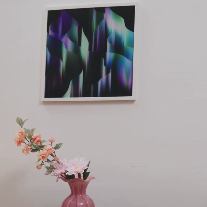 Colorful overlapping petal pattern artwork leaning against a wooden ledge.Minimalist living room with abstract black and white wall art and modern decor.Abstract circular artwork on wall, next to a sofa and a wooden table with books and a vase.