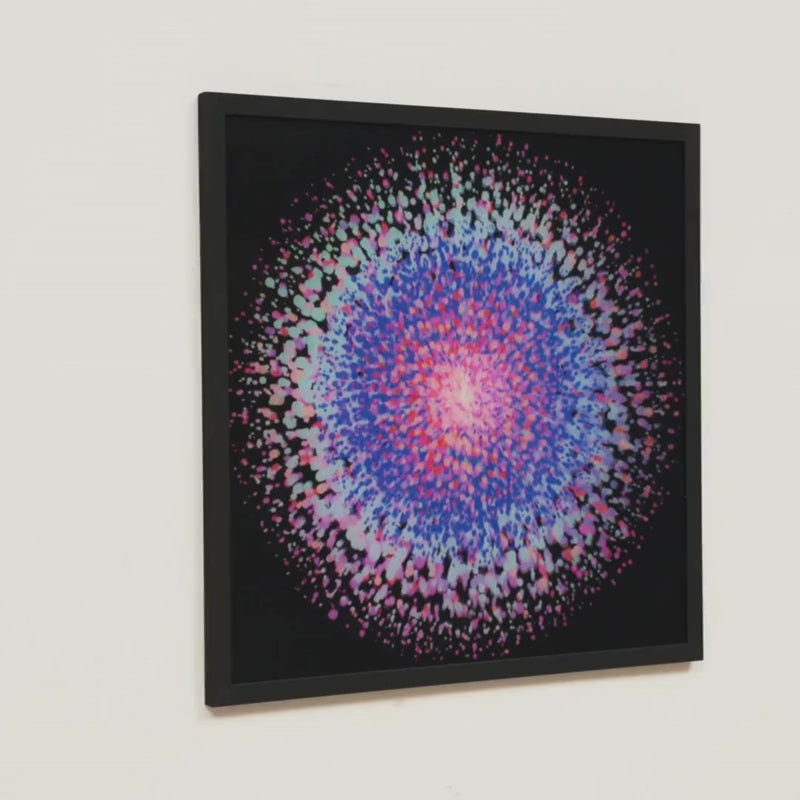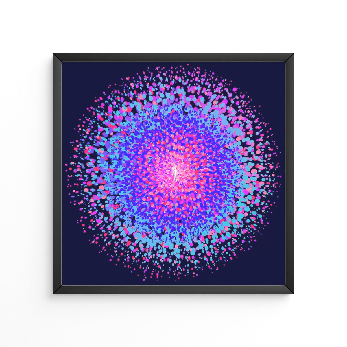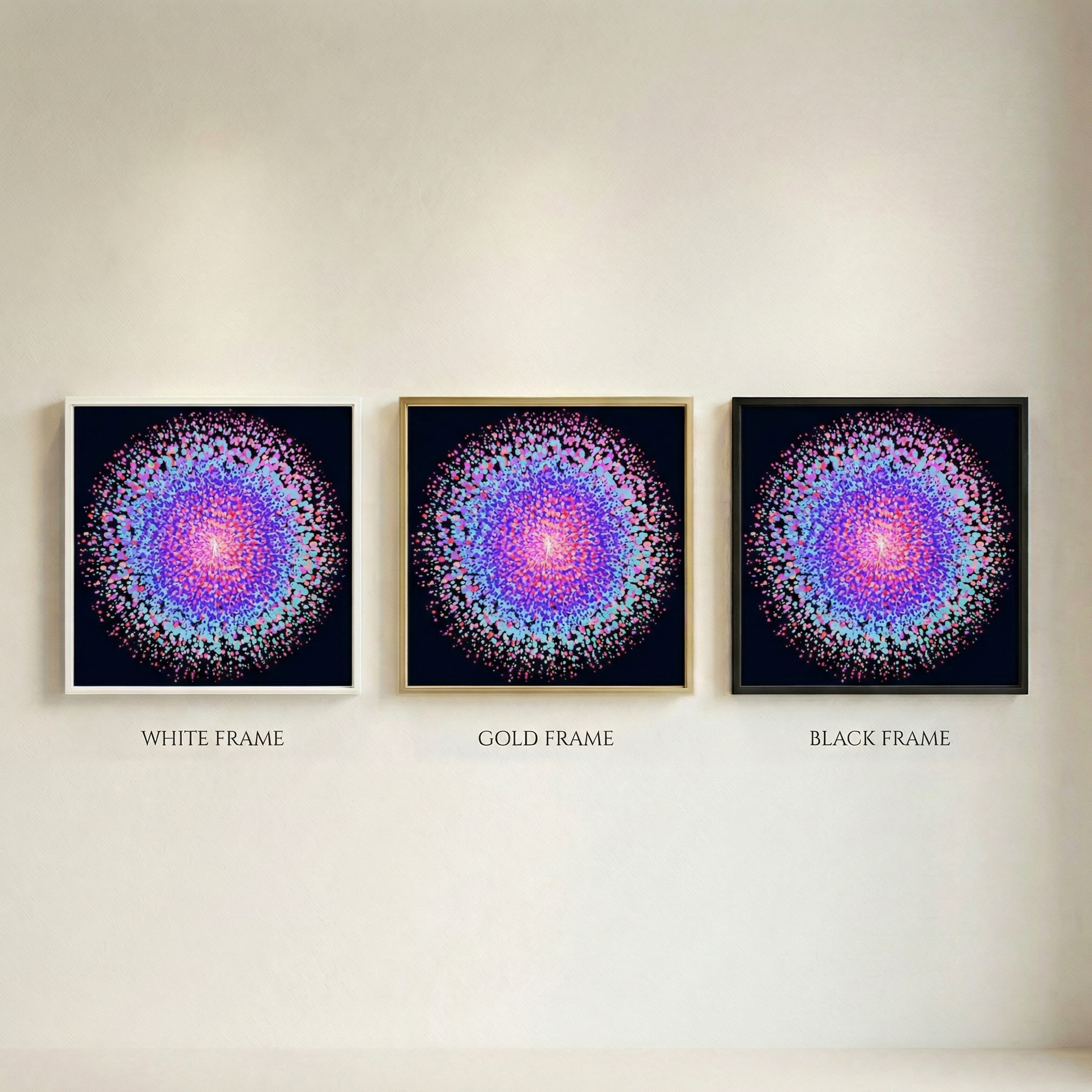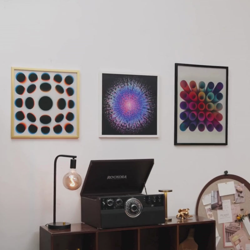 Colorful overlapping petal pattern artwork leaning against a wooden ledge.Minimalist living room with abstract black and white wall art and modern decor.Abstract circular artwork on wall, next to a sofa and a wooden table with books and a vase.