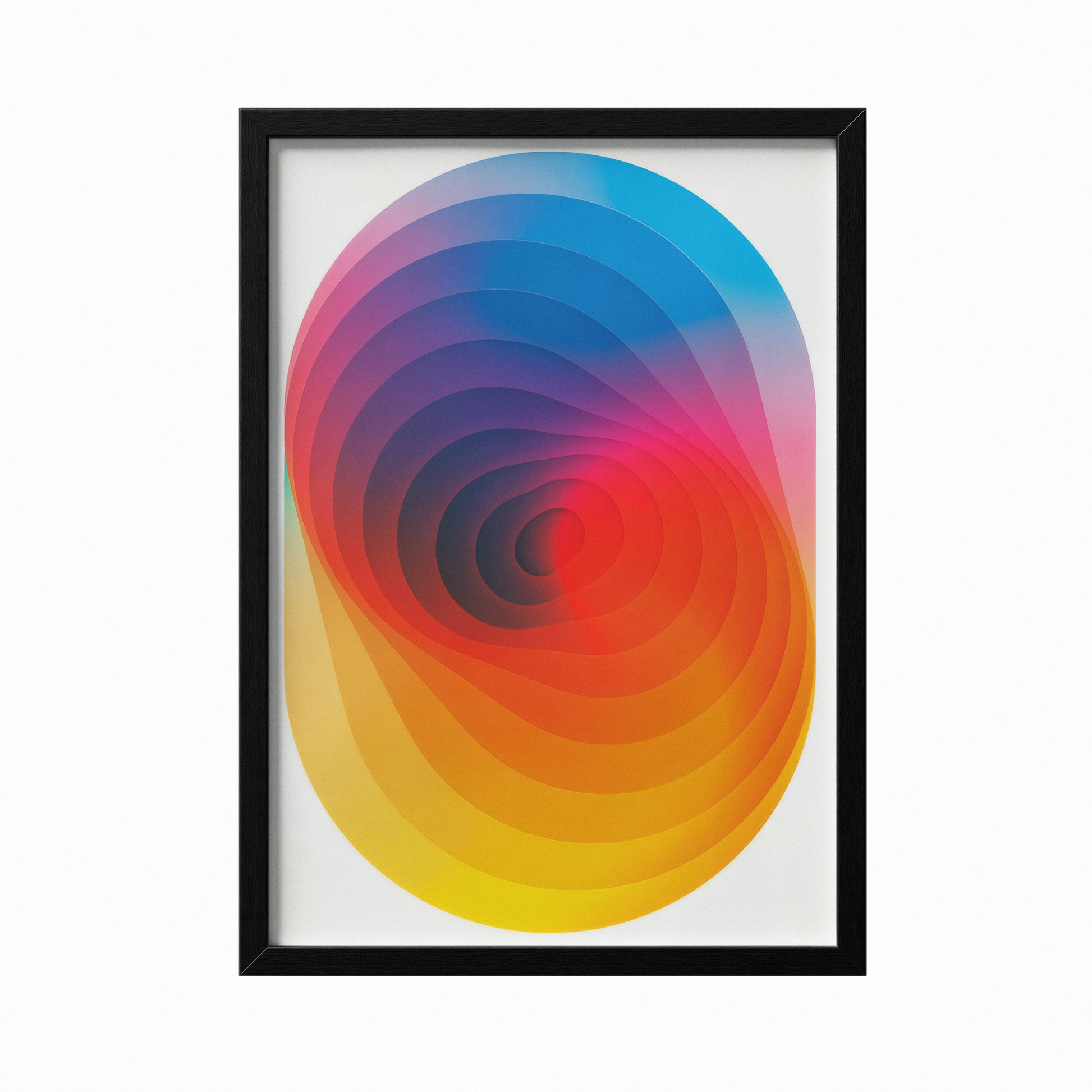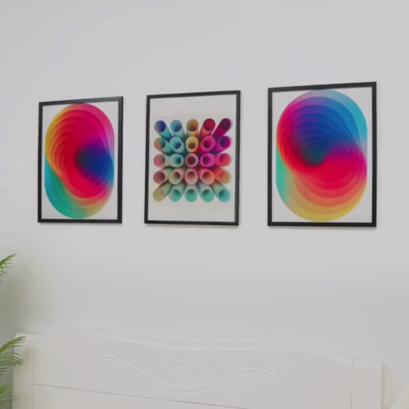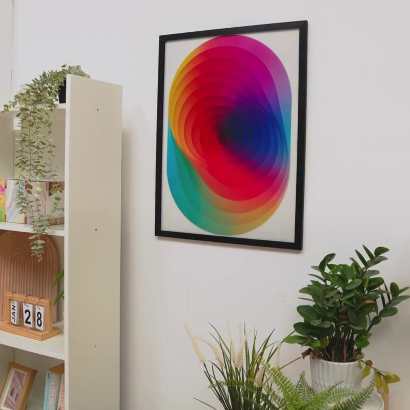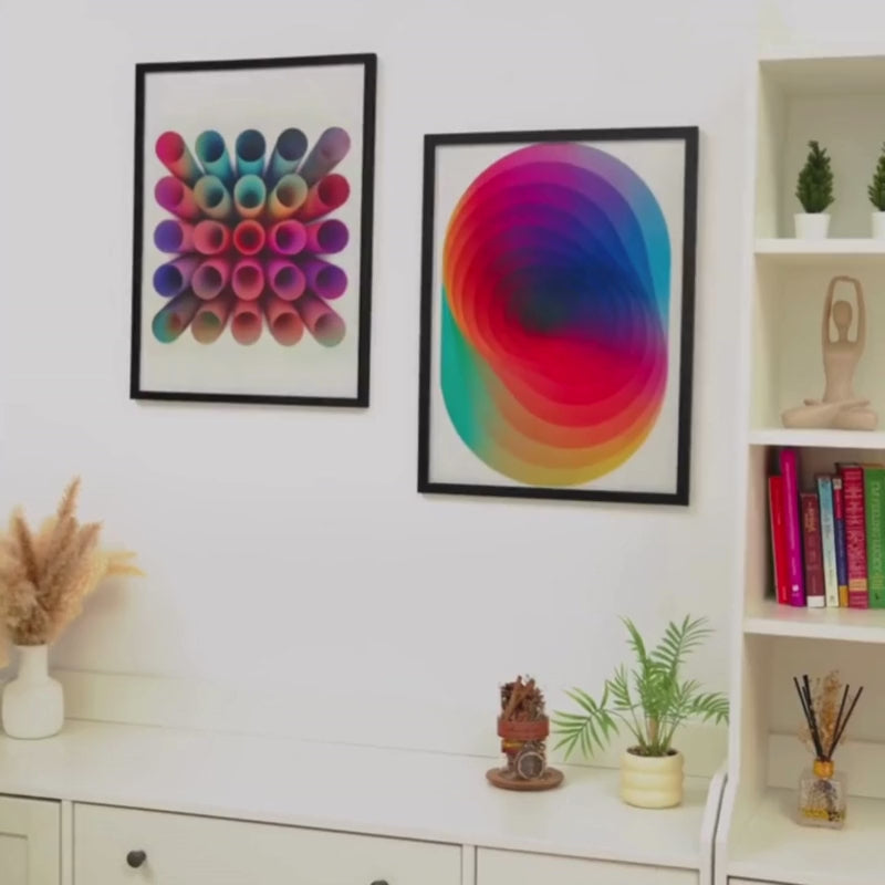 Colorful overlapping petal pattern artwork leaning against a wooden ledge.Minimalist living room with abstract black and white wall art and modern decor.Abstract circular artwork on wall, next to a sofa and a wooden table with books and a vase.