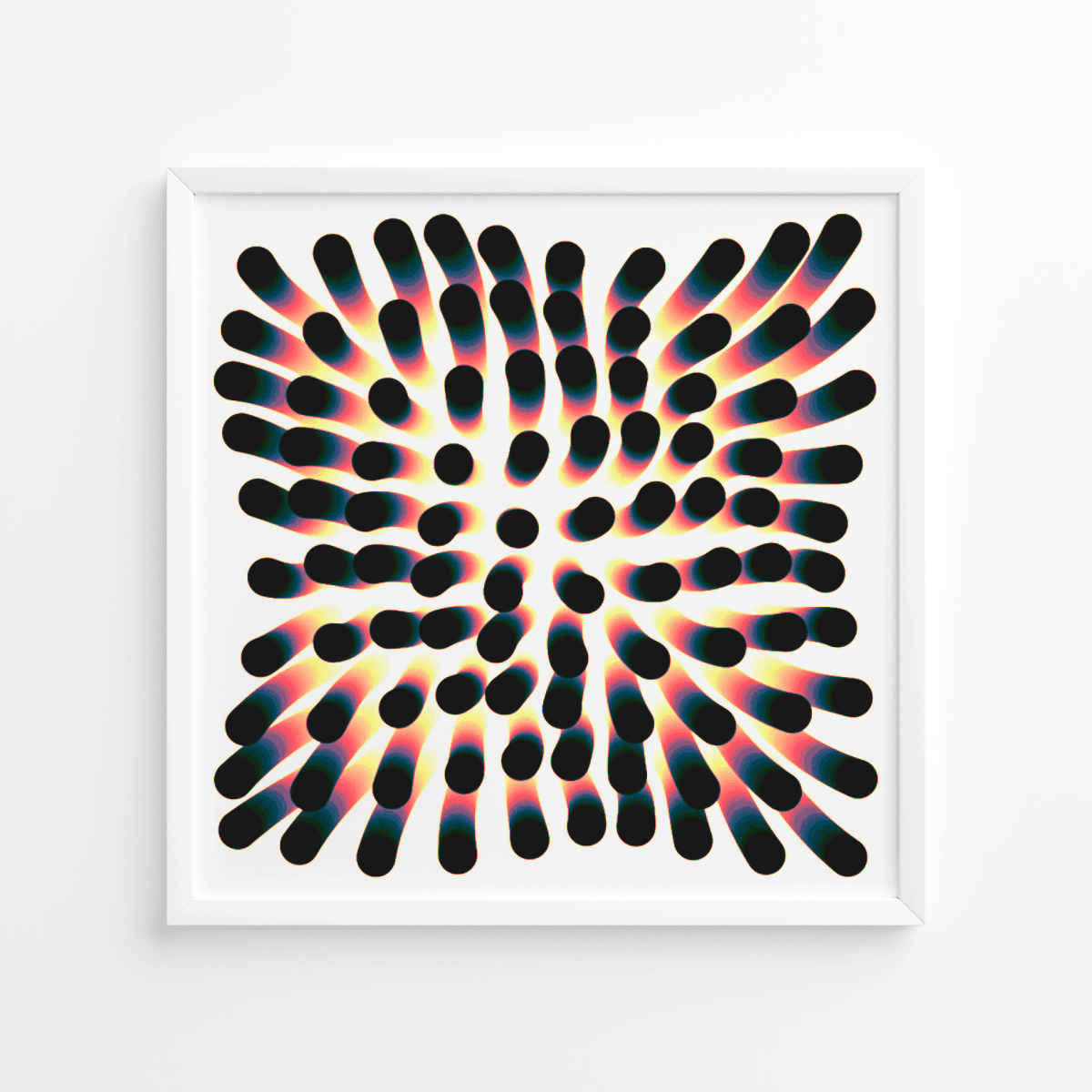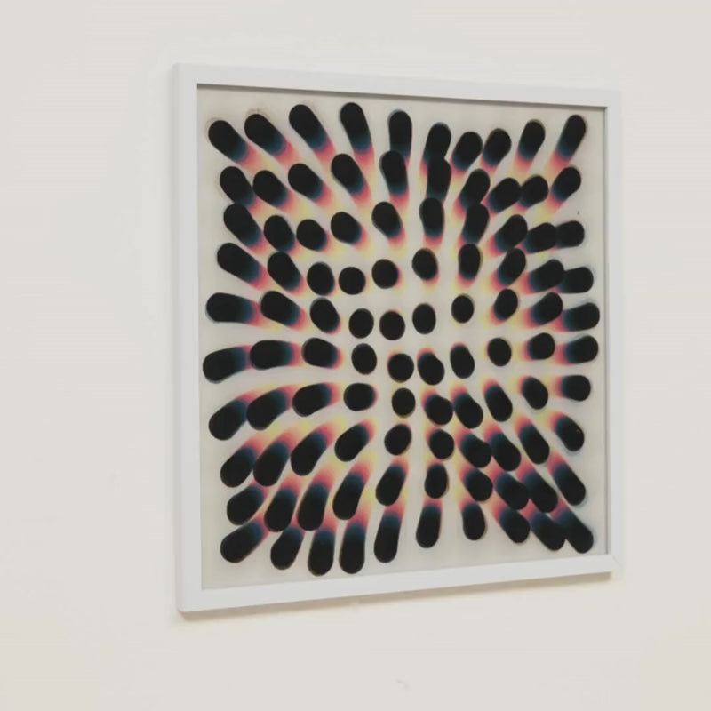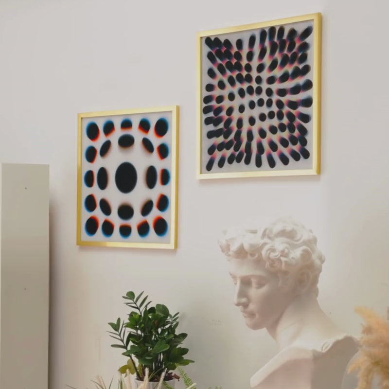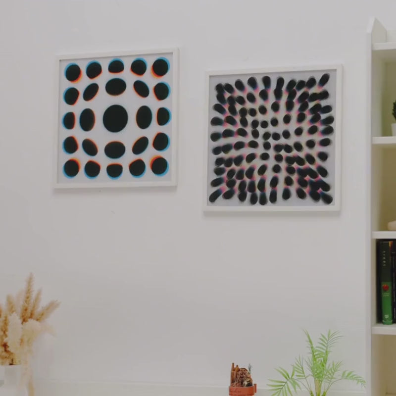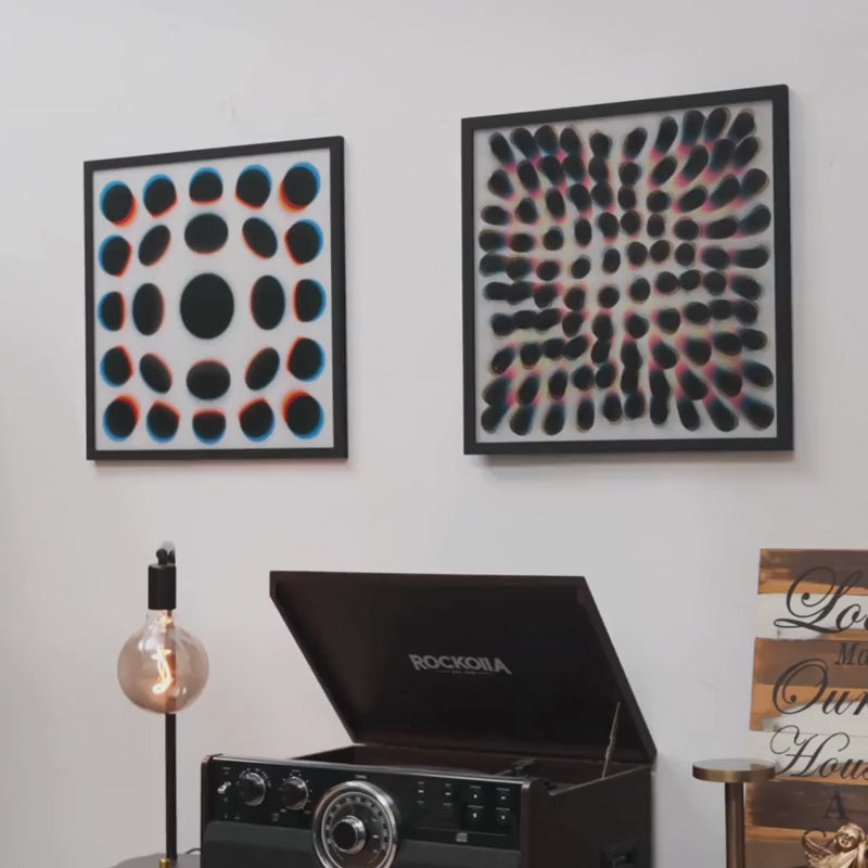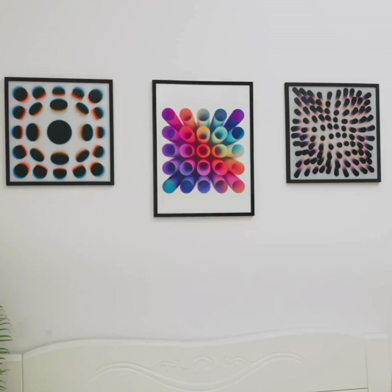 Colorful overlapping petal pattern artwork leaning against a wooden ledge.Minimalist living room with abstract black and white wall art and modern decor.Abstract circular artwork on wall, next to a sofa and a wooden table with books and a vase.