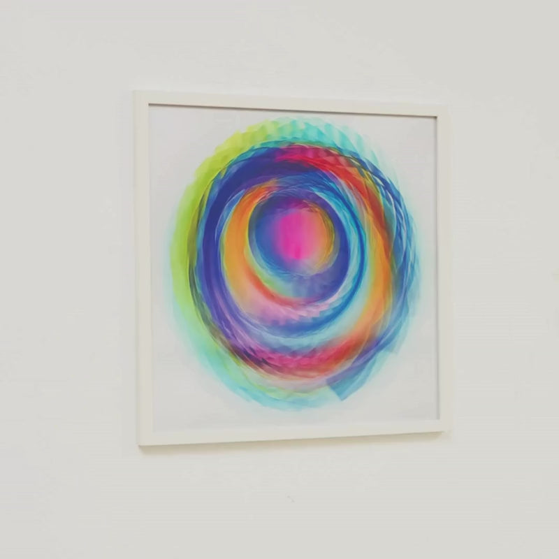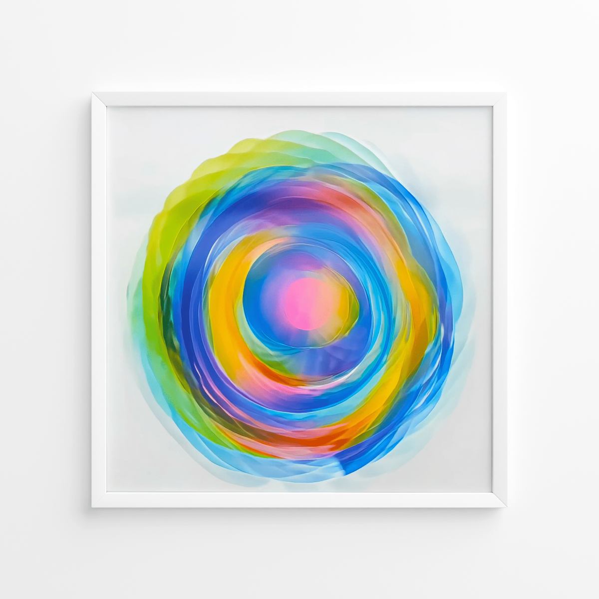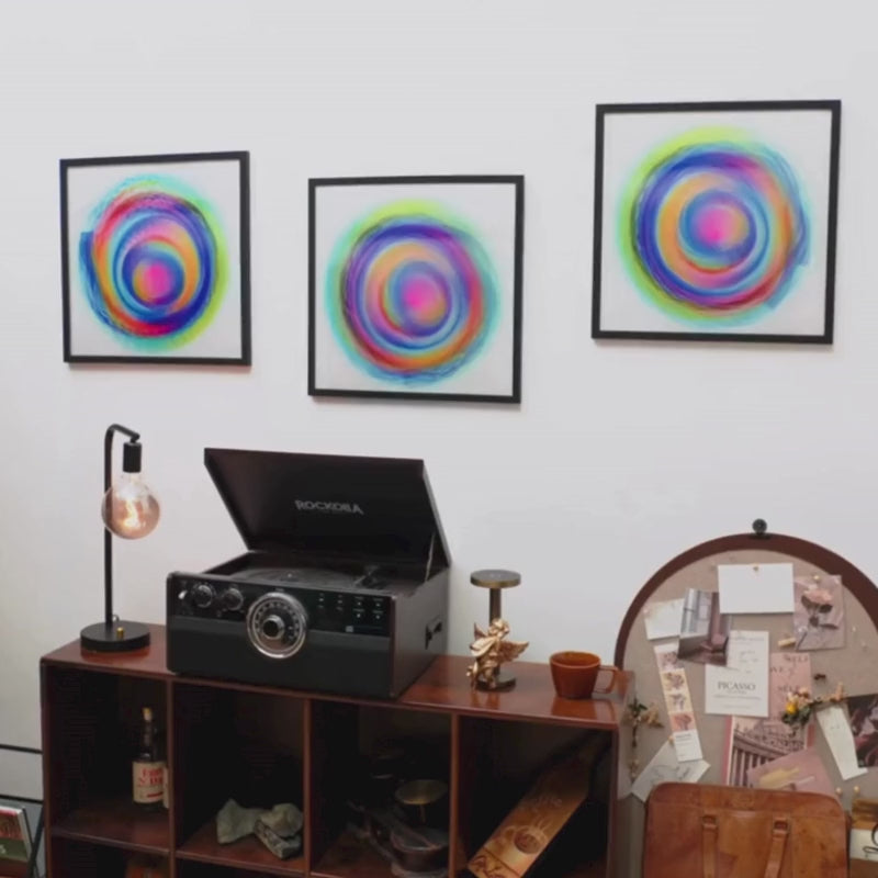 Colorful overlapping petal pattern artwork leaning against a wooden ledge.Minimalist living room with abstract black and white wall art and modern decor.Abstract circular artwork on wall, next to a sofa and a wooden table with books and a vase.