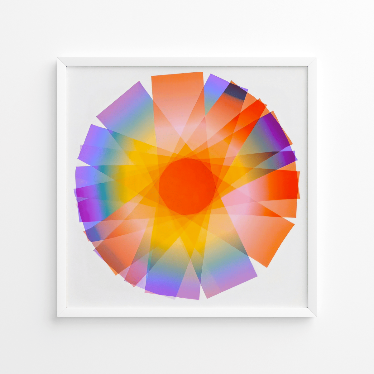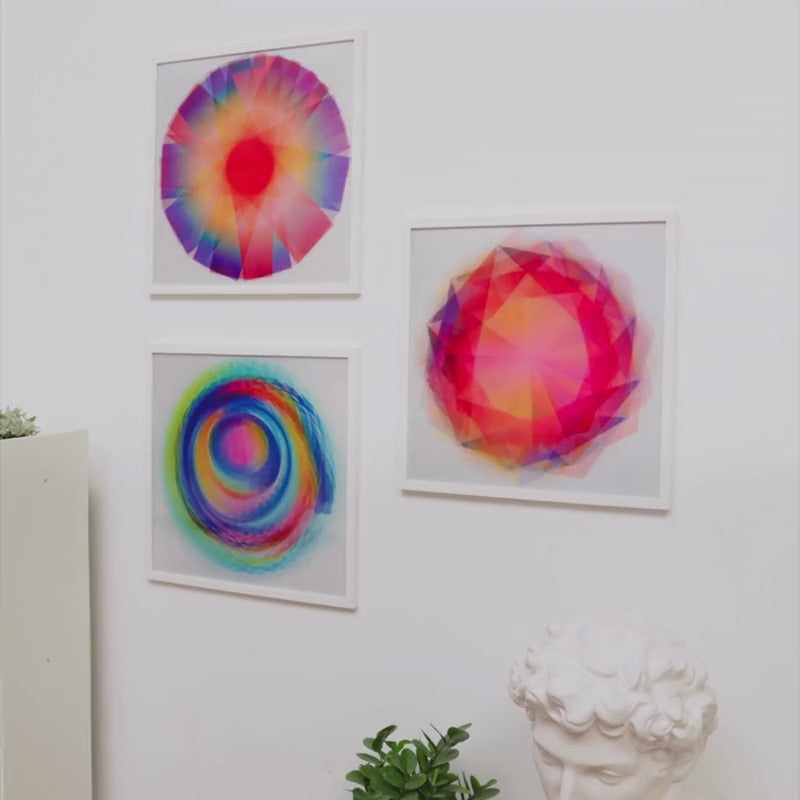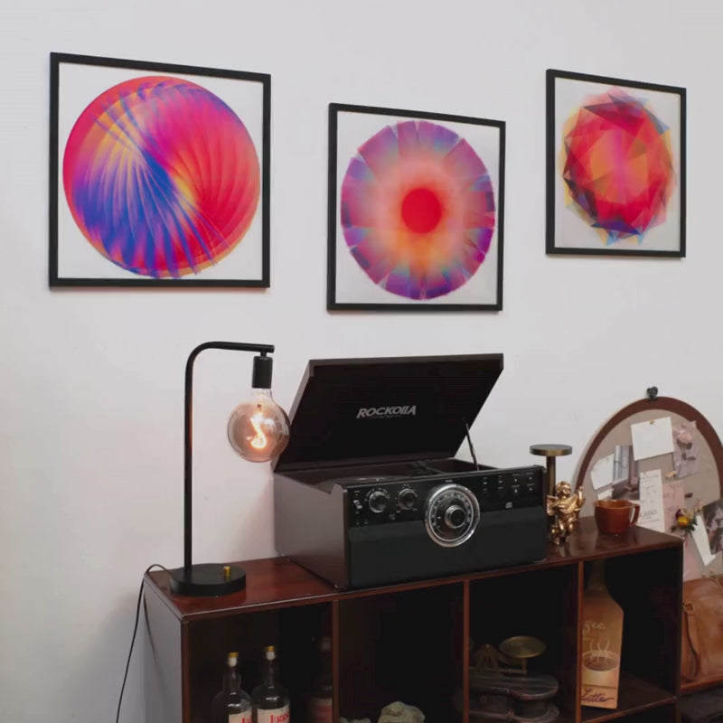 Colorful overlapping petal pattern artwork leaning against a wooden ledge.Minimalist living room with abstract black and white wall art and modern decor.Abstract circular artwork on wall, next to a sofa and a wooden table with books and a vase.