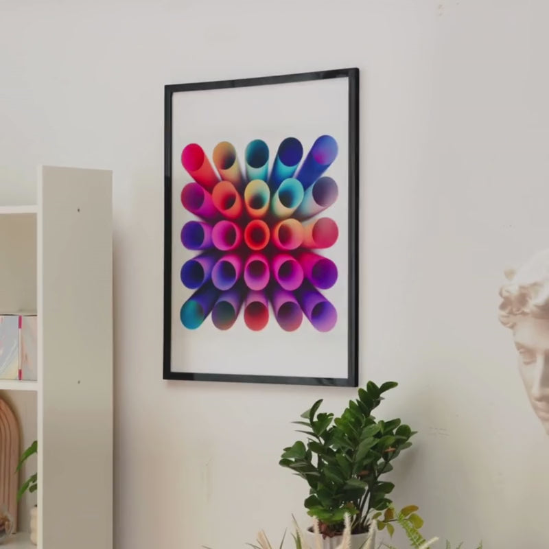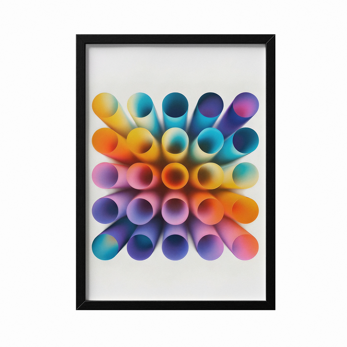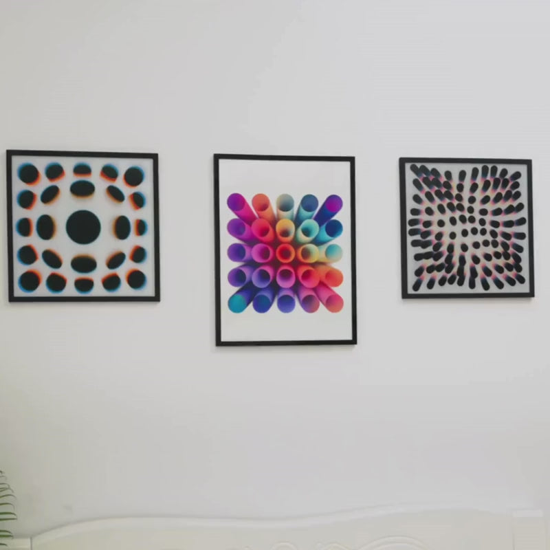 Colorful overlapping petal pattern artwork leaning against a wooden ledge.Minimalist living room with abstract black and white wall art and modern decor.Abstract circular artwork on wall, next to a sofa and a wooden table with books and a vase.