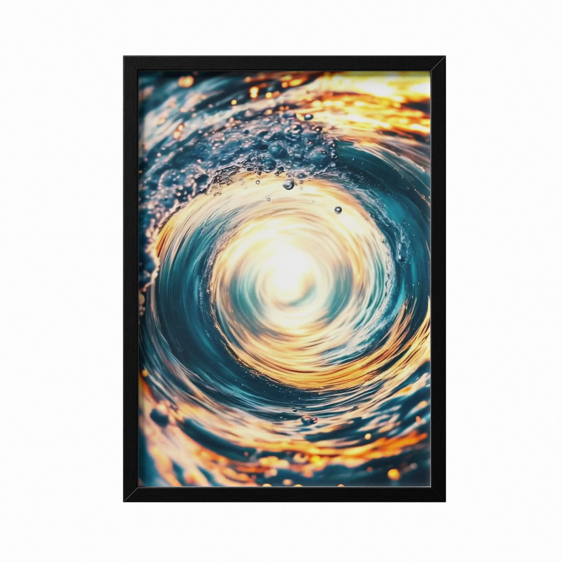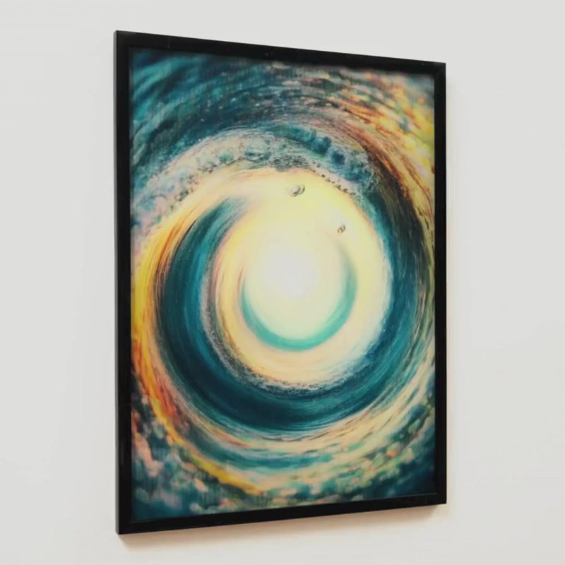 Colorful overlapping petal pattern artwork leaning against a wooden ledge.Minimalist living room with abstract black and white wall art and modern decor.Abstract circular artwork on wall, next to a sofa and a wooden table with books and a vase.